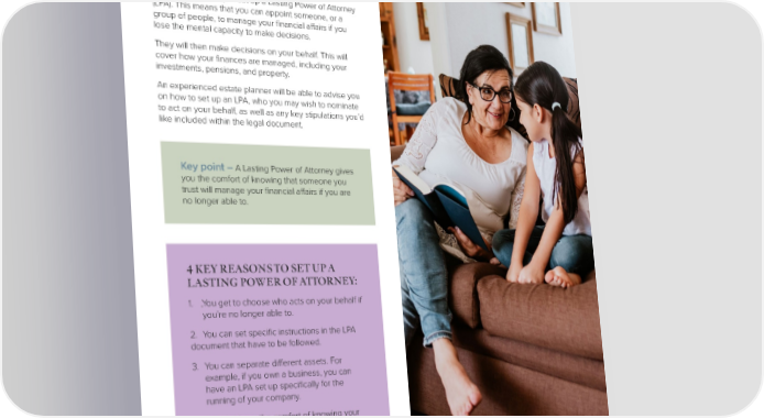 3. SET UP A LASTING POWER OF ATTORNEY A valid will guarantees that your assets will be managed in accordance with your wishes after your death. But what happens if, before your death, you are incapacitated and unable to make financial decisions yourself? The answer is that you set up a Lasting Power of Attorney (LPA). This means that you can appoint someone, or a group of people, to manage your financial affairs if you lose the mental capacity to make decisions. They will then make decisions on your behalf. This will cover how your finances are managed, including your investments, pensions, and property. An experienced estate planner will be able to advise you on how to set up an LPA, who you may wish to nominate to act on your behalf, as well as any key stipulations you’d like included within the legal document. Key point – A Lasting Power of Attorney gives you the comfort of knowing that someone you trust will manage your financial affairs if you are no longer able to. 4 KEY REASONS TO SET UP A LASTING POWER OF ATTORNEY: 1. , You get to choose who acts on your behalf if you’re no longer able to. 2. You can set specific instructions in the LPA doc ument that have to be followed. 3. You can separate different assets. For example, if you own a business, you can have an LPA set up specifically for the running of your company. 4. You will have the comfort of knowing your financial affairs will be managed by someone you know and trust.