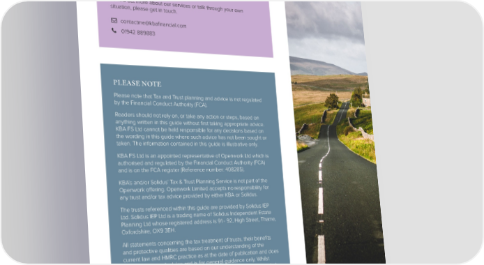 HOW WE CAN HELP Helping families protect their wealth and create certainty for their family and future generations is what we are truly passionate about. We can help you achieve the peace of mind that comes with correctly organising your inheritance affairs, while also helping you to protect your hard-earned wealth for the next generation. To find out more about our services or talk through your own situation, please get in touch. contactme@kbafinancial.com 01942 889883 PLEASE NOTE Please note that Tax and Trust planning and advice is not regulated by the Financial Conduct Authority (FCA). Readers should not rely on, or take any action or steps, based on anything written in this guide without first taking appropriate advice. KBA FS Ltd cannot be held responsible for any decisions based on the wording in this guide where such advice has not been sought or taken. The information contained in this guide is illustrative only. KBA FS Ltd is an appointed representative of Openwork Ltd which is authorised and regulated by the Financial Conduct Authority (FCA) and is on the FCA register (Reference number: 408285). KBA’s and/or Solidus’ Tax & Trust Planning Service is not part of the Openwork offering. Openwork Limited accepts no responsibility for any trust and/or tax advice provided by either KBA or Solidus. The trusts referenced within this guide are provided by Solidus IEP Ltd. Solidus IEP Ltd is a trading name of Solidus Independent Estate Planning Ltd whose registered address is 91 - 92, High Street, Thame, Oxfordshire, OX9 3EH. All statements concerning the tax treatment of trusts, their benefits and protective qualities are based on our understanding of the current law and HMRC practice as at the date of publication and does not form personal advice and is for general guidance only. Whilst every effort is made to ensure accuracy, no liability can be accepted for any errors or omissions. Levels and bases of, and reliefs from taxation are subject to change.
