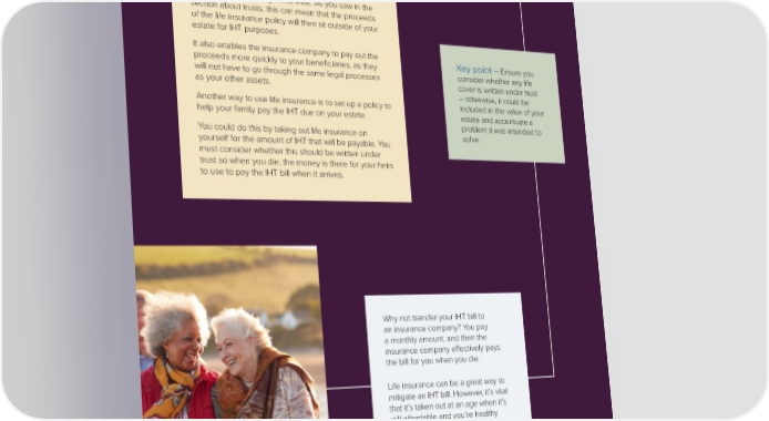 8. MAKE SURE YOU MANAGE YOUR LIFE INSURANCE EFFECTIVELY If you have existing life cover, make sure you consider any benefits of placing it into trust. As you saw in the section about trusts, this can mean that the proceeds of the life insurance policy will then sit outside of your estate for IHT purposes. It also enables the insurance company to pay out the Key point – Ensure you proceeds more quickly to your beneficiaries, as they consider whether any life will not have to go through the same legal processes cover is written under trust as your other assets. –otherwise, it could be Another way to use life insurance is to set up a policy to included in the value of your help your family pay the IHT due on your estate. estate and accentuate a You could do this by taking out life insurance on problem it was intended to yourself for the amount of IHT that will be payable. You solve. must consider whether this should be written under trust so when you die, the money is there for your heirs to use to pay the IHT bill when it arrives. Why not transfer your IHT bill to an insurance company? You pay a monthly amount, and then the insurance company effectively pays the bill for you when you die. Life insurance can be a great way to mitigate an IHT bill. However, it’s vital that it’s taken out at an age when it’s still affordable and you’re healthy enough to get cover. Talk to us to find out how we can help.
