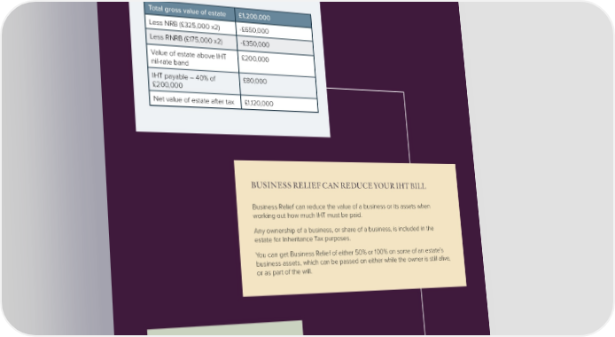 Example 2 - A widow owning a property In this second example, a widow has died, four years after the death of her husband. Her husband’s nil-rate band has been passed to her. On her death, her property was worth £400,000. Total gross value of estate £1,200,000 Less NRB (£325,000 x2) -£650,000 Less RNRB (£175,000 x2) -£350,000 Value of estate above IHT £200,000 nil-rate band IHT payable – 40% of £80,000 £200,000 Net value of estate after tax £1,120,000 BUSINESS RELIEF CAN REDUCE YOUR IHT BILL Business Relief can reduce the value of a business or its assets when working out how much IHT must be paid. Any ownership of a business, or share of a business, is included in the estate for Inheritance Tax purposes. You can get Business Relief of either 50% or 100% on some of an estate’s business assets, which can be passed on either while the owner is still alive, or as part of the will. Key point – Knowing how IHT is calculated will help you realise how it could impact on the value of your estate that passes to your beneficiaries on death.