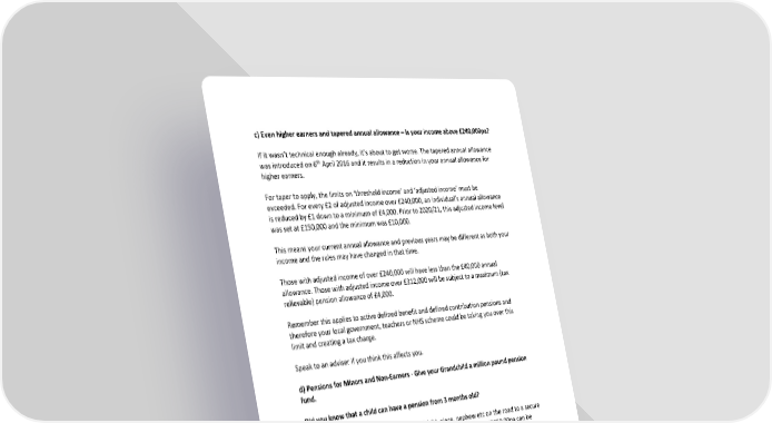 c) Even higher earners and tapered annual allowance – Is your income above £240,000pa? If it wasn’t technical enough already, it’s about to get worse. The tapered annual allowance th was introduced on 6 April 2016 and it results in a reduction in your annual allowance for higher earners. For taper to apply, the limits on ‘threshold income’ and ‘adjusted income’ must be exceeded. For every £2 of adjusted income over £240,000, an individual’s annual allowance is reduced by £1 down to a minimum of £4,000. Prior to 2020/21, this adjusted income level was set at £150,000 and the minimum was £10,000. This means your current annual allowance and previous years may be different as both your income and the rules may have changed in that time. Those with adjusted income of over £240,000 will have less than the £40,000 annual allowance. Those with adjusted income over £312,000 will be subject to a maximum (tax relievable) pension allowance of £4,000. Remember this applies to active defined benefit and defined contribution pensions and therefore your local government, teachers or NHS scheme could be taking you over this limit and creating a tax charge. Speak to an adviser if you think this affects you. d) Pensions for Minors and Non-Earners - Give your Grandchild a million pound pension fund. Did you know that a child can have a pension from 3 months old? Yes, its true, you can start your child, grandchild, niece, nephew etc on the road to a secure financial future by starting their pension planning early. As a minor, £2880.00pa can be invested into a pension per annum which attracts tax relief from HMRC of £720.00 meaning the total contribution into the pension is £3,600pa (Only £2,880 from you personally). This is then invested and has the beauty of compound returns until their retirement age which, if the amount is invested every year until they are 18, will have a huge impact on their pension planning. As it is in their name, if you were to die it is theirs, no inheritance tax to consider as the £2880.00 would be below the annual gifting allowance. Based on a 5% net return and a retirement age of 65, the pension would be worth £1,000,000 just from the payments from 0 -18 years old (and hopefully they would add to it later, on top). A million- pound pension fund. Now that is a way to leave a legacy. This is the same for non-earners, they can invest the same £2880.00pa and benefit from the £720.00 in tax relief so if you have a spouse that is a homemaker or is off work for whatever reason, don’t let them have a gap in their retirement planning, if you have capacity to do so make sure you utilise this allowance as you cannot get it back if lost. You can even do this if you are retired and under 75, you will still get the tax relief.