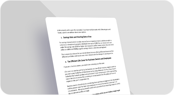 to let property with a gain (for example). If you have multiple assets with different gains and losses, speak to an adviser about your options. 5. Savings Rate and Starting Rate of tax For savings interest (which includes returns from an investment bond and interest within a collective or investment account), individuals have up to £1000 they can receive each year under the savings rate (£500 for higher rate taxpayers) and for lower earners they also could utilise an additional £5000pa against savings interest, called the starting band. This is especially relevant for our retired clients that are utilising different allowances from different portfolios and may be even more relevant with the changes to capital gains tax. 6. Tax Efficient Life Cover for Business Owners and Employees If you are a business owner, you need to be reviewing your life cover. Life cover can now be paid for by the business as a tax efficient business expense and can pay out to your family free of inheritance tax by using a Relevant Life Plan. If you haven’t looked at this fantastic product and particularly if your company year-end is approaching, now is the time to review this as making an annual payment for this policy will have an impact on this year’s corporation tax. Business owners should also be considering share-purchase arrangements for shareholders and key person cover for their main employees to ensure the business continues in all circumstances. Also group benefits which sets you aside from competing companies whilst the recruitment world is so tough. You need to take out any new protection policies whilst you are healthy enough to get cover. 7. Venture Capital Trusts (VCTs) Although higher risk than normal investments, VCTs can potentially offer a good alternative for higher earners particularly where they have used their Annual Allowance for their pensions. A VCT gives a 30% income tax reducer against income tax due to be paid in that tax year. It is not a relief; you must have the income tax due to offset against. The investment must remain in the fund for 5 years and potentially gives tax free dividends during that time. The gains are free of CGT as well. There are a range of VCTs available with different strategies, risk and track records and there are generally two windows available to invest in a VCT, January to March and then September. This can be alongside a pension strategy for those with a higher risk appetite. Remember if you don’t use your allowances, you may lose them, so it is vital that you have your savings, pensions and investments arranged in a way to maximise your available allowances in line with your personal circumstances.