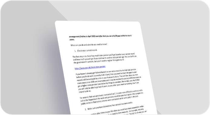 arrangement finishes in April 2023 and after that you can only fill gaps within the last 6 years. What can you do and what do you need to know? 1. Check your current record. The first step is to check how much state pension you’ll get based on your current record and how much you will get if you continue to work to state pension age. You can do this on the government’s website, but you’ll need to register for a gateway ID. https://www.gov.uk/check-state-pension If you haven’t already got full entitlement or are not on track for the full state pension before you finish work (currently £185.15pw), then you need to check the gaps in your record and there should be a link in your forecast to do so. That will then show you how many years since 2006 are incomplete and it may be worthwhile paying to fill these years to get a higher state pension (see below for things to consider). Remember, post April 2023 you will only be able to go back 6 years, so any older years need completing now if you intend to do so. For anyone that was previously ‘contracted out’, it is even more difficult to work out and a call to the Department for work and pensions would be your best option. Most people in a public sector or final salary scheme were contracted out at some point in the past. 2. Make sure you have claimed any free national insurance credits. There are certain other times in your life when you could have been awarded NI credits when you may not have been and you need to claim manually. For example, statutory maternity, caring for relatives or a spouse of the armed forces. The full list of what you can claim for and how to manually apply is detailed here https://www.gov.uk/national- insurance-credits/eligibility These may not have been automatically added to your record. You should automatically have been applied NI credits in all of the following scenarios: • Employed and earning at least £6,396 a year • Self-employed with profits of at least £6,725 a year ('small profits threshold') • Claiming universal credit • On jobseeker's allowance and not in education/working for 16 hours or more every week • On maternity allowance • On income support and providing 'regular and substantial care' • In a couple and both getting working tax credits (only one of you will get NI credits) • On carer's allowance • A parent registered for child benefit for a child under 12