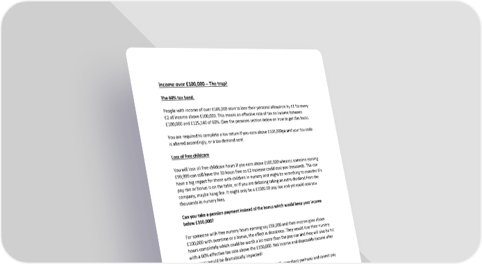 Income over £100,000 – The trap! The 60% tax band. People with income of over £100,000 start to lose their personal allowance by £1 for every £2 of income above £100,000. This means an effective rate of tax on income between £100,000 and £125,140 of 60%. (See the pensions section below on how to get this back). You are required to complete a tax return if you earn above £100,000pa and your tax code is altered accordingly, or a tax demand sent. Loss of free childcare You will lose all free childcare hours if you earn above £100,000 whereas someone earning £99,999 can still have the 30 hours free so £2 increase could cost you thousands. This can have a big impact for those with children in nursery and might be something to consider if a pay rise or bonus is on the table, or if you are debating taking an extra dividend from the company, maybe hang fire. It might only be a £1000.00 pay rise and yet could cost you thousands in nursery fees. Can you take a pension payment instead of the bonus which would keep your income below £100,000? For someone with free nursery hours earning say £98,000 and their income goes above £100,000 with overtime or a bonus, the effect is disastrous. They would lose their nursery hours completely which could be worth a lot more than the pay rise and they will also be hit with a 60% effective tax rate above the £100,000. Net income and disposable income after expenses would be dramatically impacted! If you’re over your annual pension allowance (an NHS consultant perhaps) and cannot pay into a pension to improve the situation, then this is a major headache. It's one to plan for and one to make sure you have done everything you can. Speak to the team on how to help. Additional rate taxpayers Currently the 45% tax rate is only charged on income above £150,000. As of April 2023, this will reduce to apply to income above £125,140. Due to the reduction or loss of the personal allowance between £100,000 and £125,140 this means that someone earning or having income of (for example) £140,000 would pay 40% on income between £50,270 to £100,000, an effective rate of 60% on income between £100,000 and £125,140 and then 45% above this figure. Pension contributions for those who haven’t maximised their annual allowances and are in this bracket are a must.